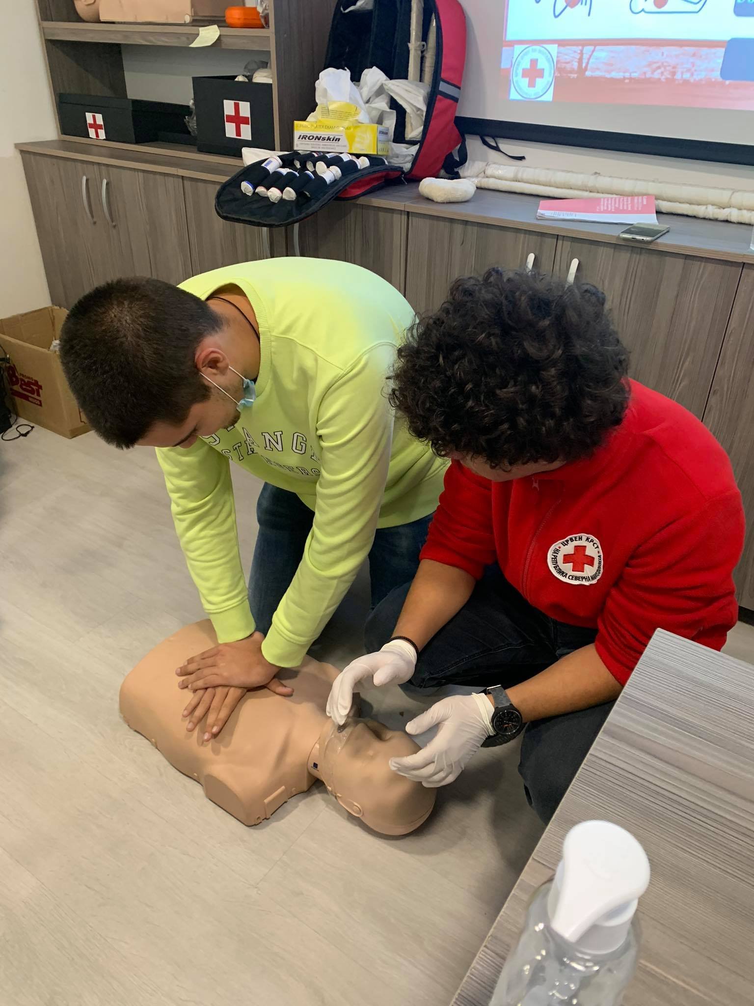 Во продолжение, како дел од практичната обука, на учениците им се презентираа вештините на давање на прва помош на повредени лица, која беше остварена од страна на наш волонтер, кој истовремено е и ученик во ова училиште.