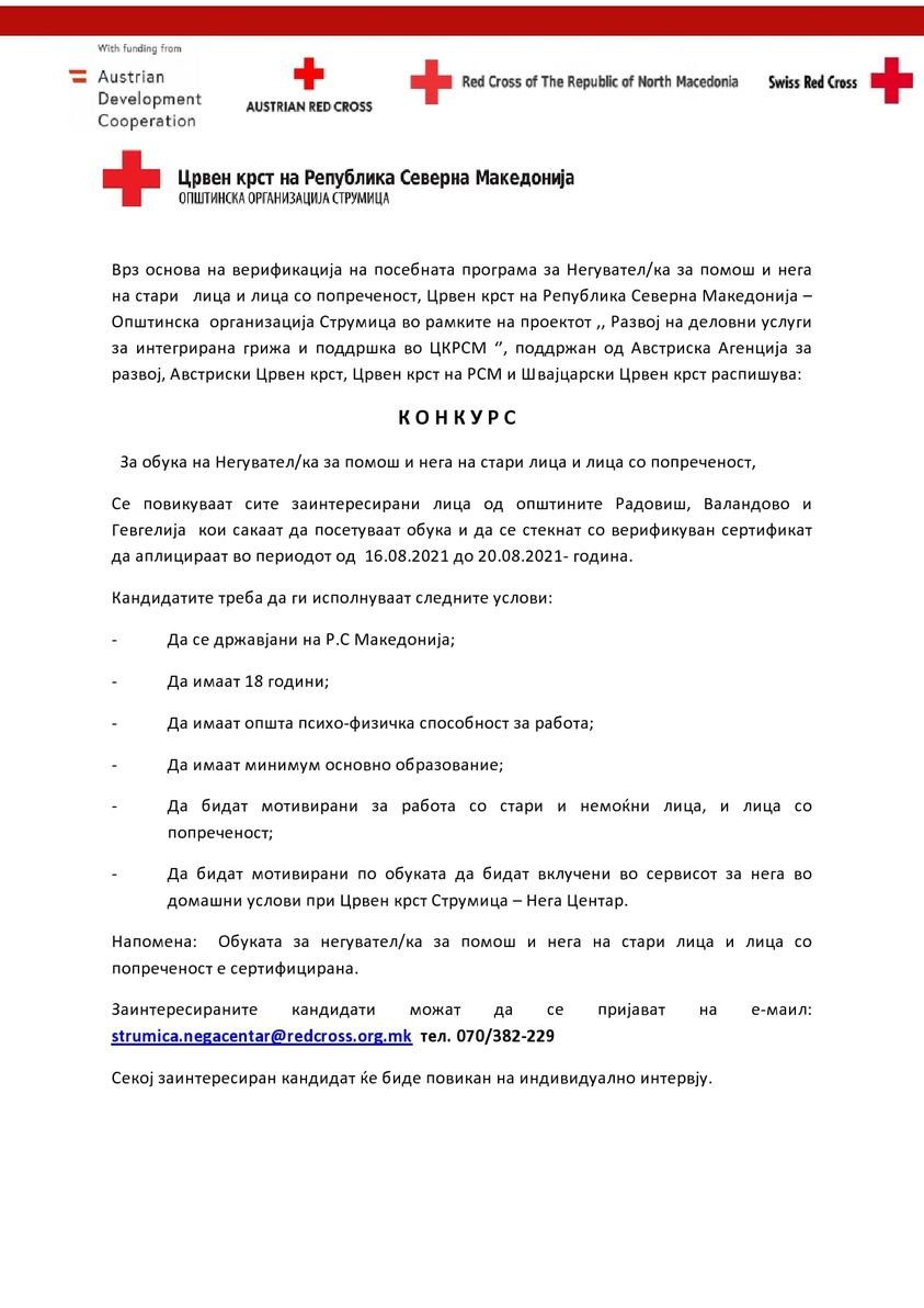 Се повикуваат сите заинтересирани лица од општините Радовиш, Валандово и Гевгелија кои сакаат да посетуваат обука за негувател/ка на стари лица и лица со попреченост и да се стекнат со верификуван сертификат да аплицираат во периодот од 16.08.2021 до 20.08.2021- година.